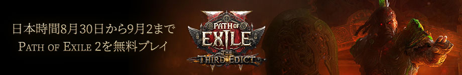 日本時間8月30日(土)のPath of Exile 2: The Third Edictに開始を記念して、全プラットフォーム(スタンドアロンクライアント、Steam、Epic Games、Xbox X|S、PlayStation 5)で、史上初となる3日間無料プレイを実施いたします。