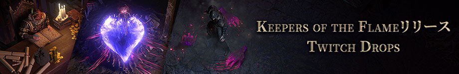 Twitch ドロップPath of Exile: Keepers of the Flameのリリースを祝うために、2週間の間、Twitchドロップイベントを11月1日午前4時から行います第一週Twitchドロップ - エグザイルの金庫番隠れ家装飾品 + ブリーチロードの爪キャラクターエフェクト開始時間: 10月31日午後12時 PDT (お客様のタイムゾーンで10月 31, 2025 3:00 午後 (GMT-4)) 終了時刻: End Time: 11月8日午前2時59分 PST (お客様のタイムゾーンで11月 08, 2025 5:59 午前 (GMT-5)) リリースの第一週にPath of Exileカテゴリーのいずれかのチャンネルを 累計3時間視聴するとエグザイルの金庫番隠れ家装飾品とブリーチロードの爪キャラクターエフェクトを獲得できます。 第二週Twitchドロップ - ゼシュトのスラムレアフィニッシャーエフェクト開始時間: 11月8日午前3時 PST (お客様のタイムゾーンで11月 08, 2025 6:00 午前 (GMT-5)) 終了時間: 11月16日午前2:59 PST (お客様のタイムゾーンで11月 16, 2025 5:59 午前 (GMT-5)) リリースの第二週にPath of Exileカテゴリーのいずれかのチャンネルを 累計3時間視聴するとゼシュトのスラムレアフィニッシャーエフェクトを獲得できます。 ドロップは上記の決められた時間、いずれかのPath of Exile配信をご覧いただいた全ての方に保証されています。プロモーションは全てのアカウントで利用いただけます 配信者をサポートしようコミュニティストリーマーをサポートするために日本時間11月1日午前4時から11月16日午後8時まで Twitch サブスクを2個分購入するかギフトした方に、畏怖の化身ポータルエフェクトを進呈します。 参加するには:
